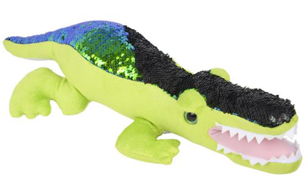 The 19” sequin alligator is an eye catching plush that makes a unique addition to your collection. Run your hand over the gator to flip the sequins and change the color! Features a shiny pattern and hard plastic eyes.